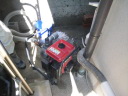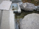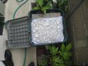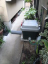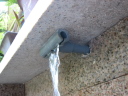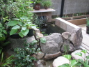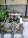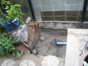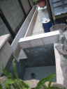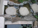 (最初のはじまり) 今年(H19年)の夏は特別に暑かった。最近の温暖化という話題ではなく、この夏いっぱいかかった「めだか池」づくりの話題である。 7月1日、ジジが開設しているホームページ(検索<庭の花おりおり>)7月ページ表紙の準備を始めた。そこに、「夏は水辺 メダカの一つ二つ泳ぐのも涼し」と書き込んだとき、子供のころ(もう55年ほど前にもなるのか)、家のそばの溝に「めだか」がたくさん泳いでいた光景がよみがえった。懐かしい!!とたんにそれまでの水蓮鉢ではなく池で泳ぐめだかを見たくなり、その日から自宅の庭でめだかを泳がせることに没頭することとなった。最初のデスクワーク、坪庭程度の狭い庭なので企画と設計図面に苦慮呻吟することになったが、そのジジの様子に、横から「たら婦人」が「いけ垣の棒樫の木を抜いてそこに溝を作ったらどう?」というグッドアイデアを宣わった。彼女は、ときどきリスクを無視した“珍”または“名”アイデアを出す。今回は後者であった。 (「たら婦人」と「ジジ」の由来→ たらたら・・・ ) (設計図面の準備) たら婦人のグッドアイデアのお陰で、溝部分は幅約30センチ長さ約4.7メートル、池部分は内面80センチ四方、深さも約80センチの規模となった。写真bPは、苦心した実施設計図面であり、7月中旬に完成した。 (工事施行) 7月9日から棒樫の抜去作業と掘削作業を開始、作業の進行は写真bQ、写真bR、写真bS、写真bU、写真bV。一応の完成は8月16日。 溝の設置予定場所は幅が狭いので、堤は厚さ3センの御影石で作った。材料は石材商を営む知人からの特別無償提供、人の世話はしておくもの。池の内面・底には船底塗料用のFRP(写真bU)を塗布し、これで「めだか池」一応の完成。 (ろ過の仕組み) 池の水深は約80センチである。その池底中央部分に取水口をつくり、取水口から溝部分の下、地下約80センチのところで太さ10センチの塩ビパイプを約5メートル配管し、溝端でパイプを垂直に溝堤上部の高さまで立ち上げ、ここから揚水ポンプで水を汲み上げるのであるが、池底の水を汲み上げることになる(bP7)。そして、汲み上げた水をろ過装置下部から注入し、上部に出てきたろ過水を再び溝の端から注入(写真bP2)、溝を流れて池に至り水を循環させるという仕組みである。 写真bW・写真9はこのろ過装置であるが、外部箱は工具箱の下部1カ所と反対側上部2カ所に穴を開け、手作りしたもの。ジジの工夫は、この穴と注入・排水パイプの接続であったが、台所の流し台底部中央排水口を想定してもらいたい。その排水器具を工具箱横面に開けた穴に取り付けて完成させたのであるが、出来具合良し。 (したたり水落下装置) 要は、写真bP1の水のしたたりを「滝」と言いたいのであるが、面はゆいので素直でない表現となってしまった。この装置は、揚水ポンプからの水をろ過装置の方と水落下装置の方とに分岐し、細いパイプを溝の下を通して池上まで配管、そこから水を落下させるのであるが、水道の蛇口のように一筋では面白くない。そこで、流し台の給水用シャワー蛇口や塩ビパイプのT字型継ぎ手の加工(Tの横一の部分三カ所に穴を開ける)を考え実験を繰り返した。実験の結果、T字型継ぎ手に穴を開けるのではなく、一直線の切れ込みを入れたところ(写真bP0)水のしたたり具合の形がよくなった。 この装置により、池には常に水が落下するチョロチョロ音がし、また、溝の水注入口辺りはシャラシャラとせせらぎを流れる水の音、独りよがりであるがまことに心地よし。 (余談雑談) ろ過装置や水落下装置の製作を企画していた頃は、毎日のように仕事帰りの夕方5時半頃コーナンへ行っていた。夏場のジジの装束は麻地の上下スーツか綿地コードレーン織りのスーツにネクタイ姿である。その出で立ちで、毎日のように店内の水道用品や塩ビパイプのコーナー付近で商品の器具にメジャーを当てたり、考え込んでいるジジの様子が目についていたのか、ある日、女性店員が「なにかご研究でもされているんですか?」と声をかけてきた。ん!!。そんな上品なことではないので「ちょっとーめだかが・・・」、後は言葉が尻すぼみのサイレント。 (治水の難しさ) 治水というと大げさであるが、水を意のままにするのは、たいへんに、たいへん難しい出来事であった。 その1、溝の水は流れない。 溝は、底に約10pの玉砂利、その上部約20pの水深とし、ポンプアップした水を溝端から注入することにより美しい水の流れを想像したが、そう旨くは行かなかった。水は流れない。ろ過装置から注入する水の量と水深のバランスがとれず、水の流れが見えないのである。 そこで、溝の水深を浅くするため上げ底をし池に向かって高底差を作ったが、何せ水位に段差がないのであるから、流れの演出はポンプで押し出す水の量によって決まる。そこで、場水ポンプを2台とし(写真bW・写真bP7)、一方の水を直接溝に注入するようにした。そして、溝の注入口付近の玉砂利を水面辺りの高さまで