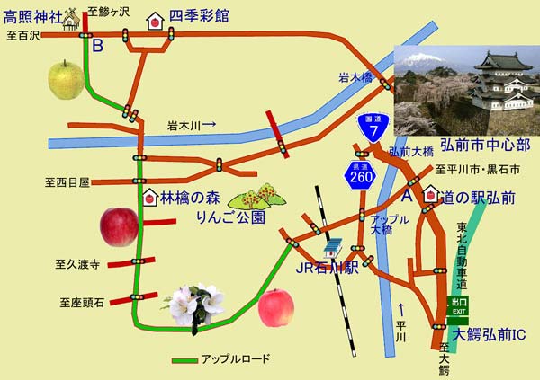 | このイラスト地図は、HP「青い森の片隅から」をアップしている作者の好意を得て転載させていただいた。同HPの下記アドレスをクリックするとアップルロードの説明が掲載されている。 http://homepage3.nifty.com/malus~pumila/mitearuku/appl_road/applroad.htm 今回の観光タクシーの行程は、弘前中心部の「ねぷた村」を出発し、地図左上の髙照神社から緑色表示のアップルロードを走行、右下の大鰐町に入り、「大鰐国際スキー場」近くの「青森ロイヤルホテル」でランチ。たいへん雰囲気の良いホテルであった。 ランチ後東北自動車道経由で青森空港。 |